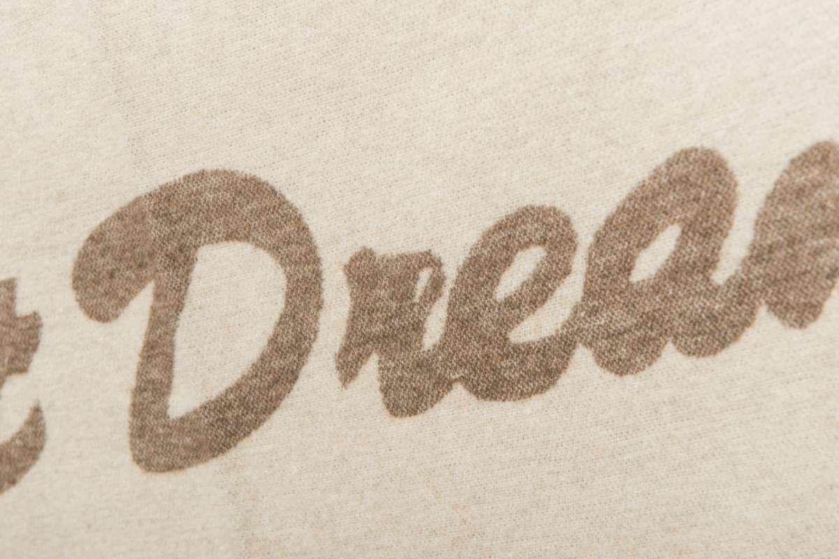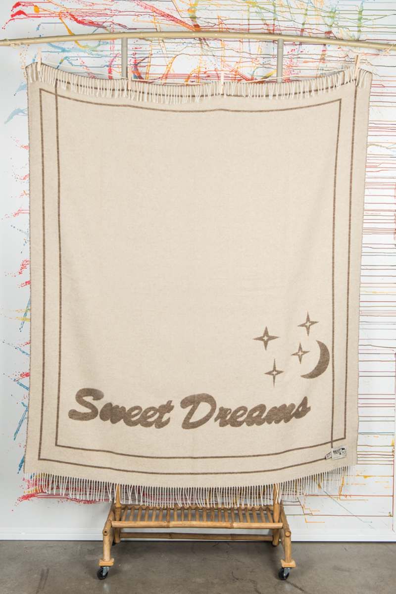 Soffice plaid bicolore con doppia cornice e scritta “Sweet Dreams” , realizzato interamente con materie prime riciclate.