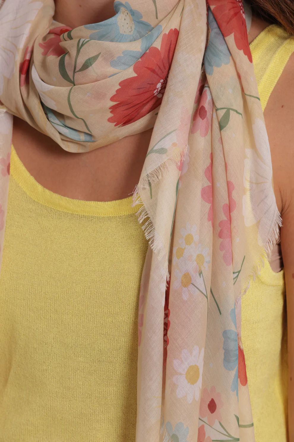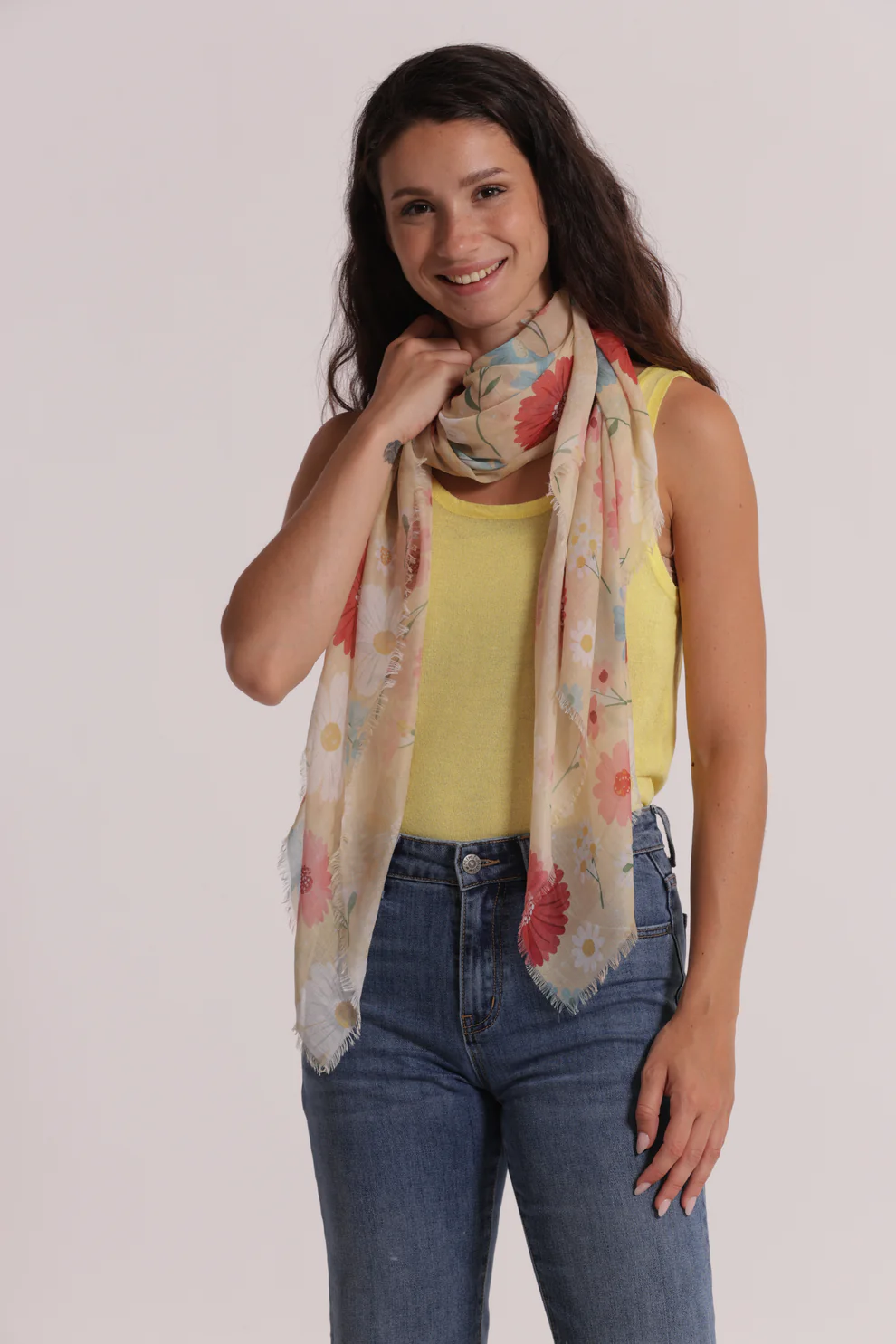 Foulard elegante e leggero con stampa di margherite, perfetto per aggiungere un tocco fresco e primaverile ai tuoi outfit. Realizzato in 100% poliestere (PL), è morbido, resistente e facile da abbinare.