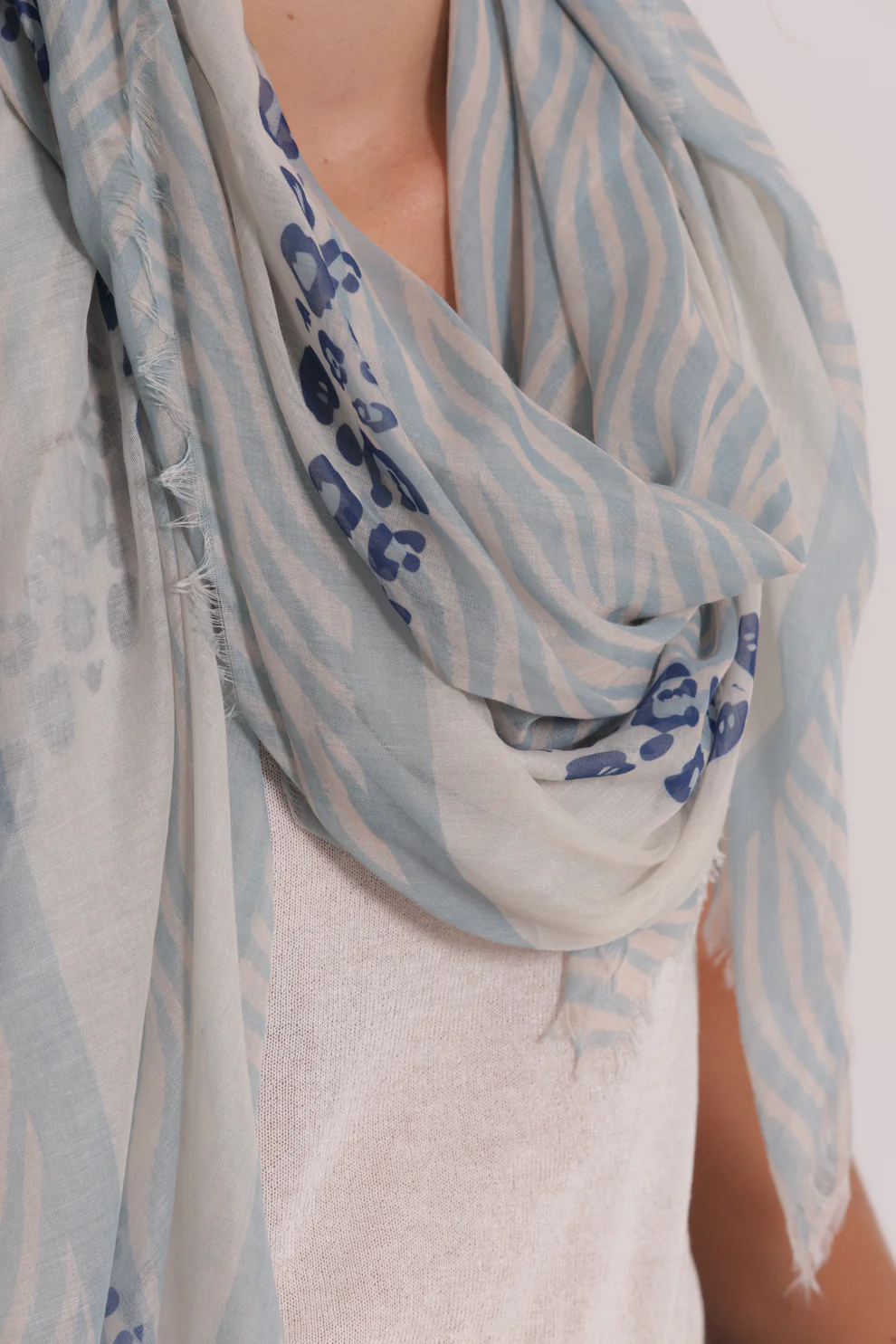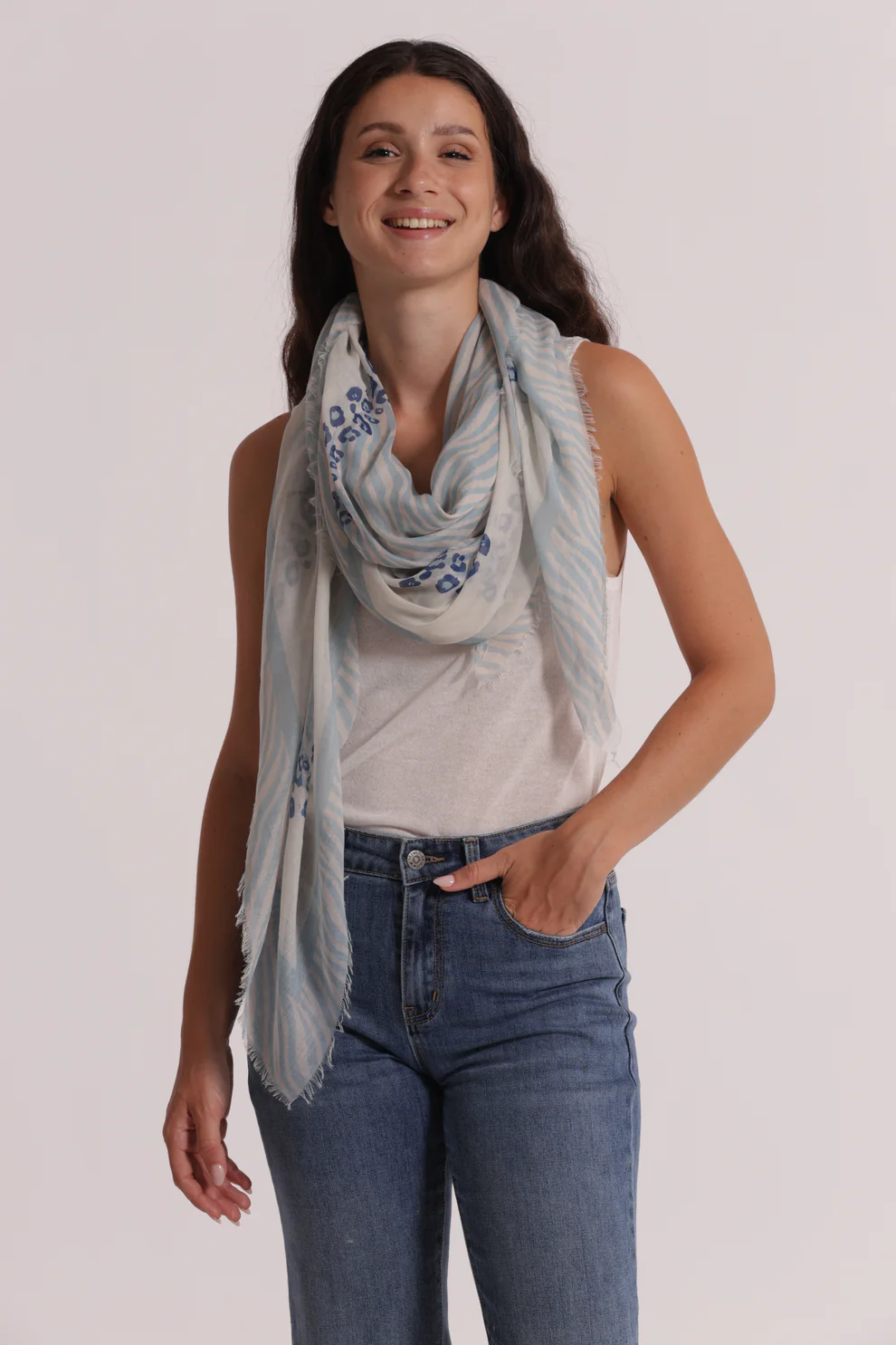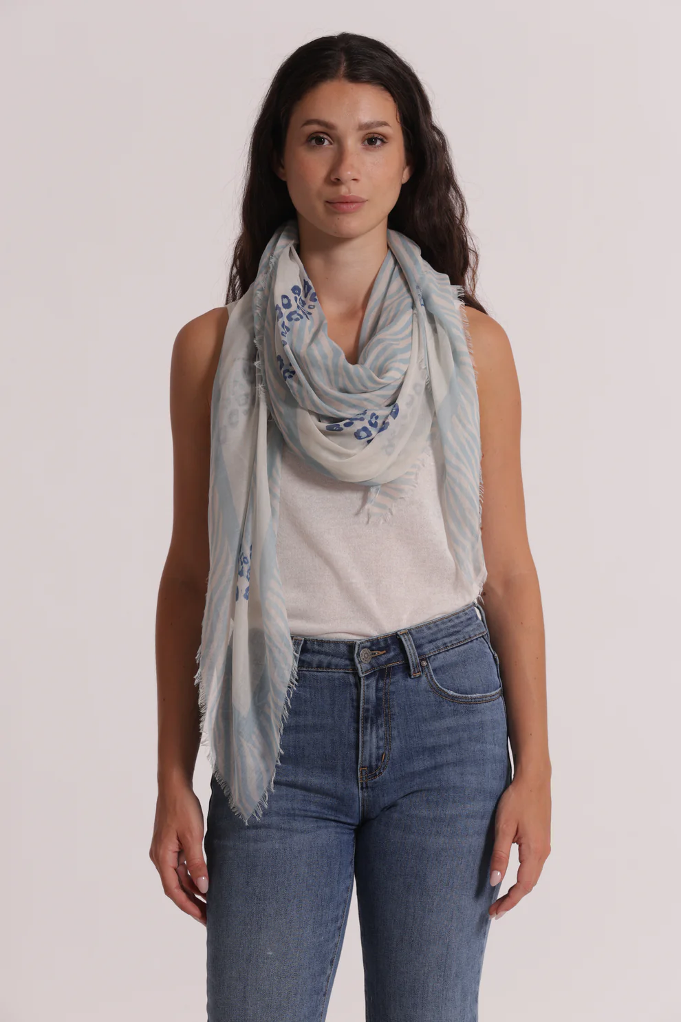 Foulard ampio con stampa animalier, perfetto per aggiungere un tocco grintoso e di tendenza ai tuoi outfit. Realizzato in 100% poliestere (PL), è morbido, leggero e versatile da indossare in molteplici modi.