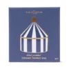 Elegante scatola portagioie in ceramica dipinta a mano dal design grafico e senza tempo, caratterizzata da ampie righe blu navy e bianche impreziosite da delicati dettagli dorati.